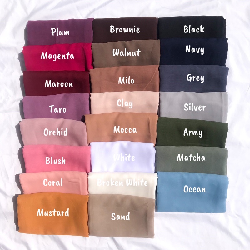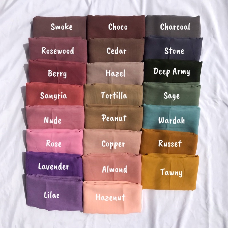 Produk ini memiliki 46 Variasi Warna yaitu : Black,Navy,Grey,Silver,Army,Matcha,Mustard,Brownie,Walnut,Sand,Milo,Mocca,White,Broken white,Maroon,Plum,Magenta,Blush,Taro,Orchid,Clay,Coral,Ocean,Smoke,Choco,Charcoal,Rosewood,Cedar,Stone,Berry,Hazel,Deep army,Sangria,Tortilla,Sage,Nude,Peanut,Wardah,Rose,Copper,Russet,Lavender,Lilac,Almond,Hazelnut,Tawny,