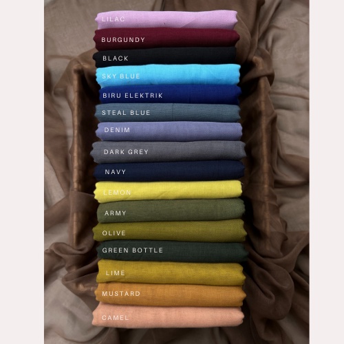 Produk ini memiliki 50 Variasi Warna yaitu : Maroon,Baby Grey,Dusty rose,Mauve,Dusty,Lilac,Pink Lily,Maccaron,Sky Blue,Salem,Peach,Butter,Army,Navy,Steal blue,Lemon,Camel,Mustard,Leaf,Orange,Terracotta,Biru elektrik,Lime,Rosebloom,Olive,Aqua,Burgundy,Black,Denim,Dark Grey,Green Bottle,Mocca,Milo,Peanut,Coklat Pramuka,Smoke Grey,Smoke,Rose,Cappucino,Nude,Milk tea,White,Broken White,Nude Pink,Chesnut,Walnut,Matcha,Plum,Frappucino,Beige,