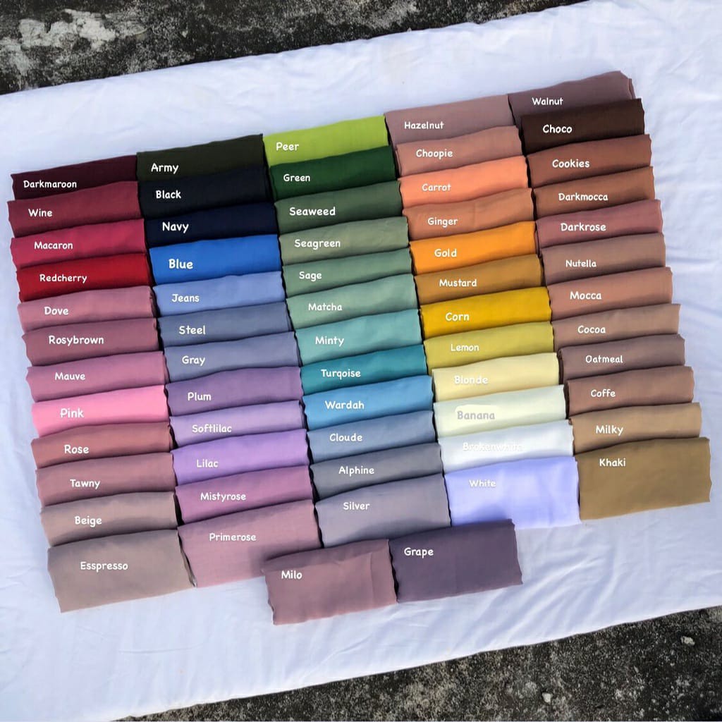 Produk ini memiliki 40 Variasi POLLYCOTTON yaitu : DARK MAROON,DOVE,ROSYBROWN,PINK,BEIGE,ESSPRESO,ARMY,BLACK,NAVY,LILAC,MILO,GREEN,MINTY,CLOUDE,ALPHINE,SILVER,CHOOPIE,GINGER,MUSTARD,CORN,BROKEN WHITE,CHOCO,DARKMOCCA,NUTELLA,OATMEAL,MILKY,PLUM,GRAY,WINE,SEAWEED,MAUVE,SOFTLILAC,CARROT,SAGE,STEEL,HAZELNUT,COOKIES,JEANS,COCOA,DITULIS DI CATATAN,