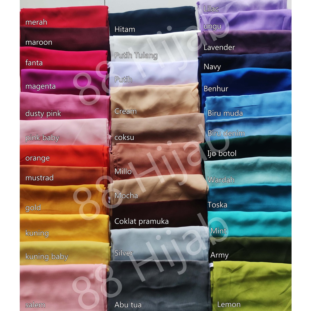 Produk ini memiliki 31 Variasi Warna yaitu : hitam,putih tulang,putih,abu silver,abu tua,merah,maroon,magenta,fanta,pink baby,salem,dusty,mocha,millo,coksu,coklat tua,navy,benhur,biru langit,toska,hijau botol,armi,lemon,wardah,kuning,gold,mustrad,ungu,lillac,lavender,reques warna,