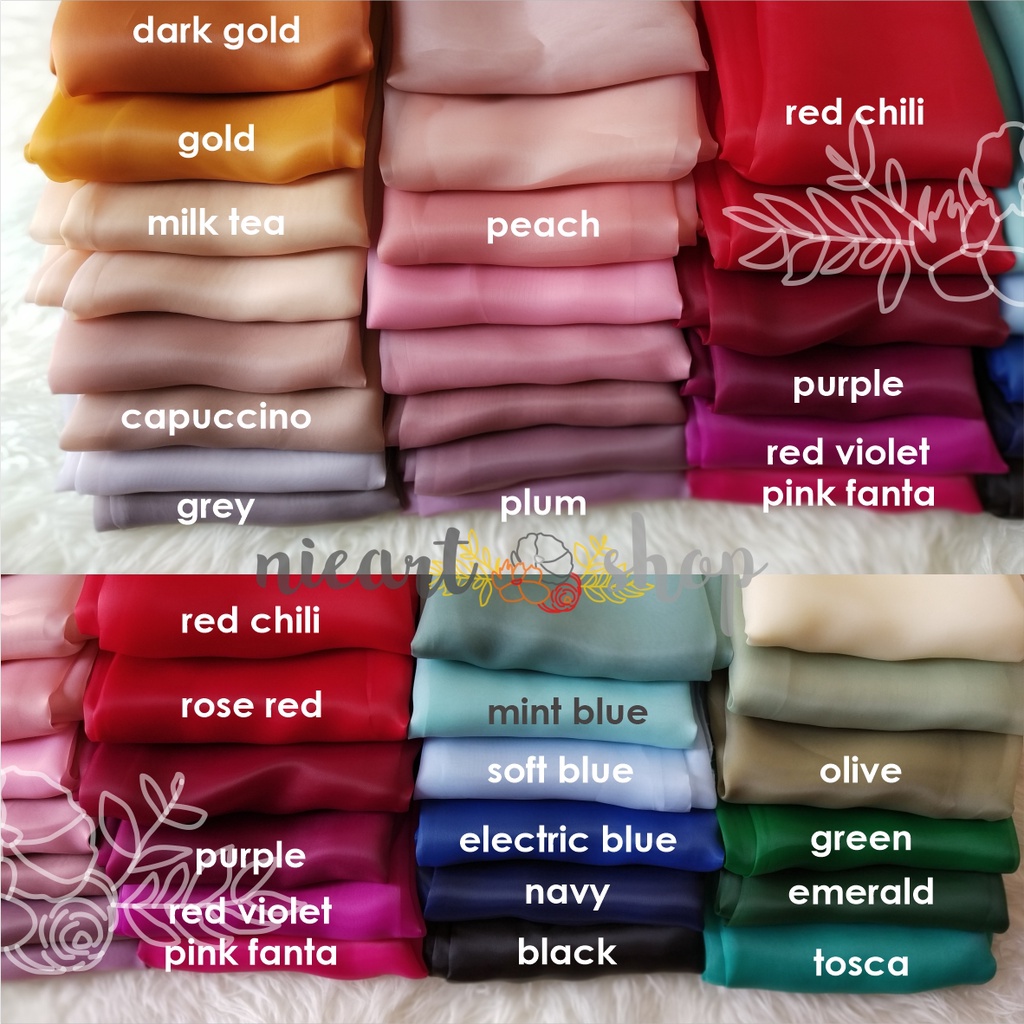 Produk ini memiliki 47 Variasi Warna yaitu : Light Grey,Nude,Milk Tea,Sand,Silver,Army,Cappucino,Pink,Soft Blue,Pale Purple,Dusty Green,Soft Peach,Baby Peach,Soft Pink,Baby Gold,Peach,Navy,Maroon,Torquoise,Black,Wardah,Baby Pink,Broken White,Gold,Dark Silver,Mocca,Emerald,Tosca,Rose Red,Lime,Powder Blue,Mustrad,Olive,Milo,Green,Mint Blue,Grey,Skyblue,Electric Blue,Pink Fanta,Red Violet,Purple,Salmon,Red Chili,Ivory,Dusty Pink,Ruby,