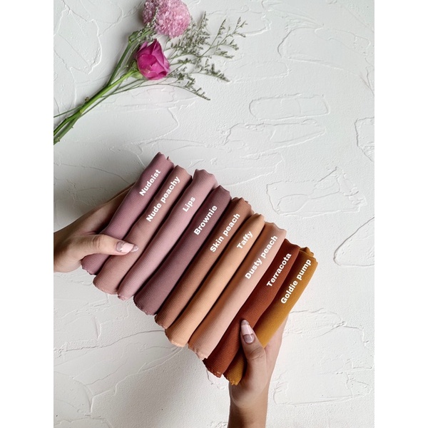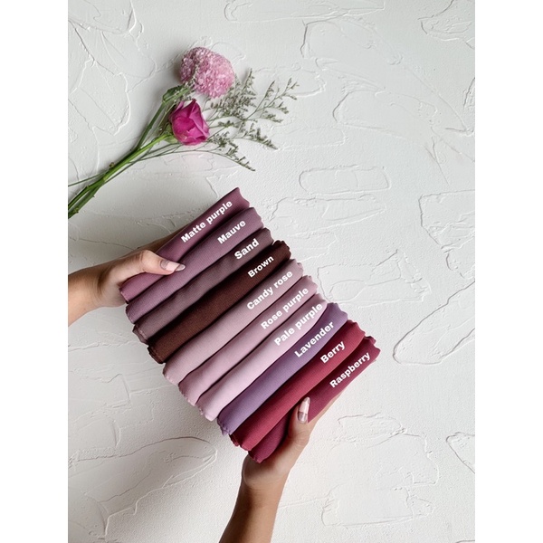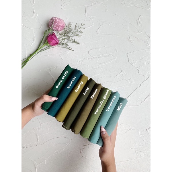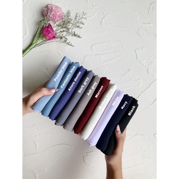 Produk ini memiliki 37 Variasi Warna yaitu : Fantastic blue,Powder blue,Azure denim,Dark grey,Ash grey,Maroon,Broken white,White,Navy,Black,Matte purple,Mauve,Sand,Brown,Candy rose,Rose purple,Pale purple,Lavender,Berry,Raspberry,Green bottle,Emerald,Gading,Army,Zaitun,Romantic green,Turquoise,Mint,Nudeist,Nude peachy,Lips,Brownie,Skin peachy,Taffy,Dusty peachy,Terracota,Goldie pump,